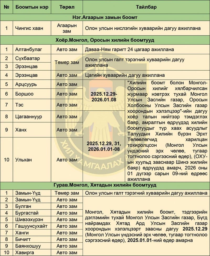 Монгол, Хятадын Замын-Үүд, Булган, Бургастай, Шивээхүрэн, Гашуунсухайт, Ханги, Бичигт, Баянхошуу, Хавирга авто замын боомтууд 2025.12.29 өдөр амарна.