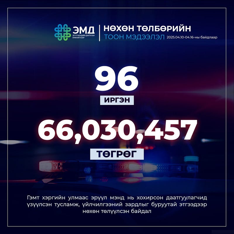 Тэгвэл 2025 оны 4 дүгээр сарын 10-наас 4 дүгээр сарын сарын 16-ны өдрүүдэд 96 даатгуулагч-иргэнд ЭМД-ын сангаас 66 сая 30 мянга 457 төгрөг зарцуулсныг хуулийн хүрээнд буруутай этгээдээр нөхөн төлүүлж, ЭМД-ын санг хохиролгүй болголоо.