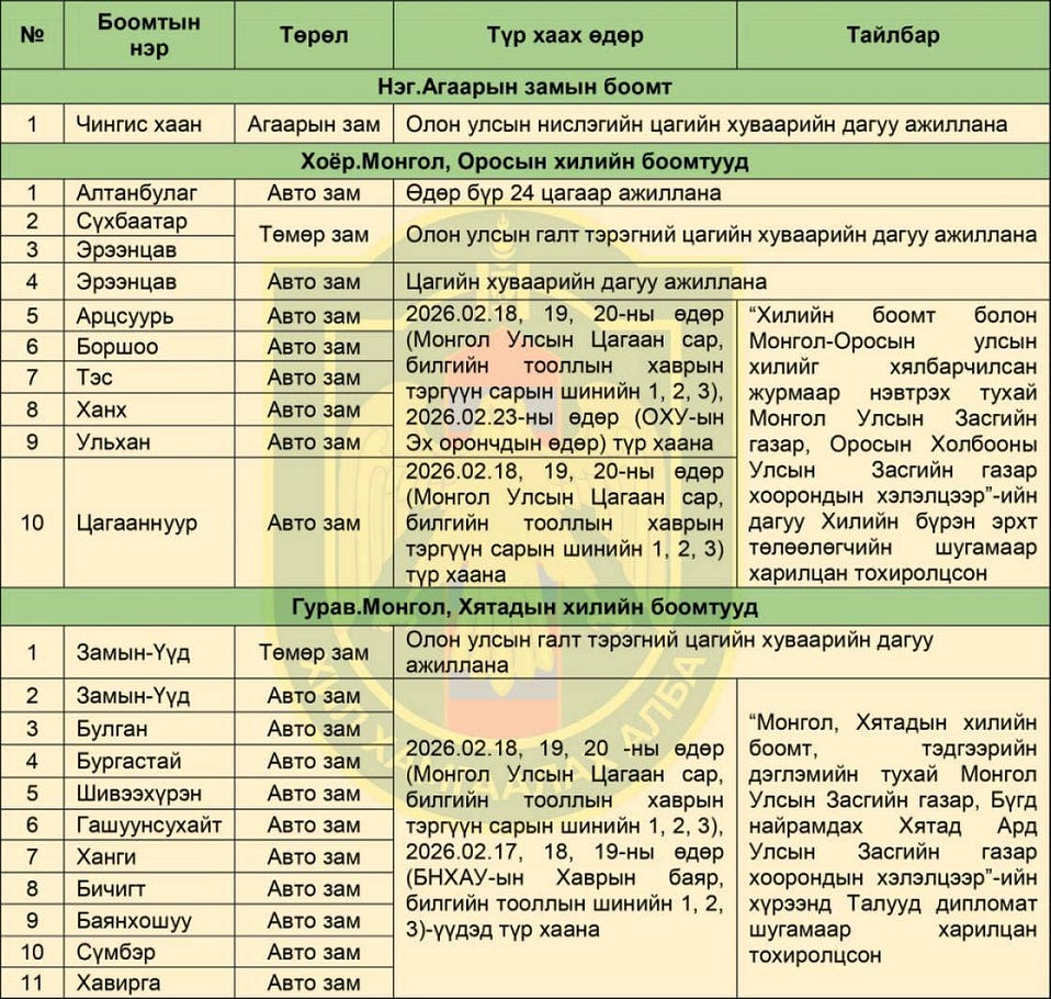 Хилийн боомтуудын 2026 оны хоёрдугаар сард ажиллах цагийн хуваарийг танилцуулж байна.