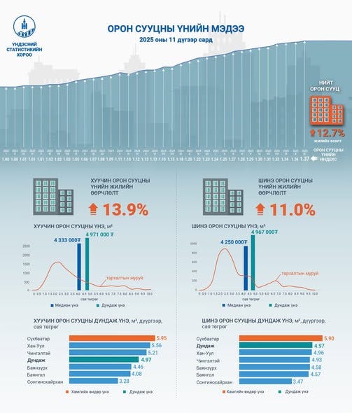Орон сууцны үнийн индекс 2025 оны 11 дүгээр сард 1.37 болж, өмнөх оны мөн үеэс 12.7 хувиар, өмнөх сараас 1.0 хувиар тус тус өссөн байна.  2025 оны 11 дүгээр сард шинэ орон сууцны 1 метр квадрат талбайн дундаж үнэ 4.97 сая төгрөг болж, Сүхбаатар дүүрэгт хамгийн өндөр буюу 5.9 сая төгрөгийн үнэтэй байна.