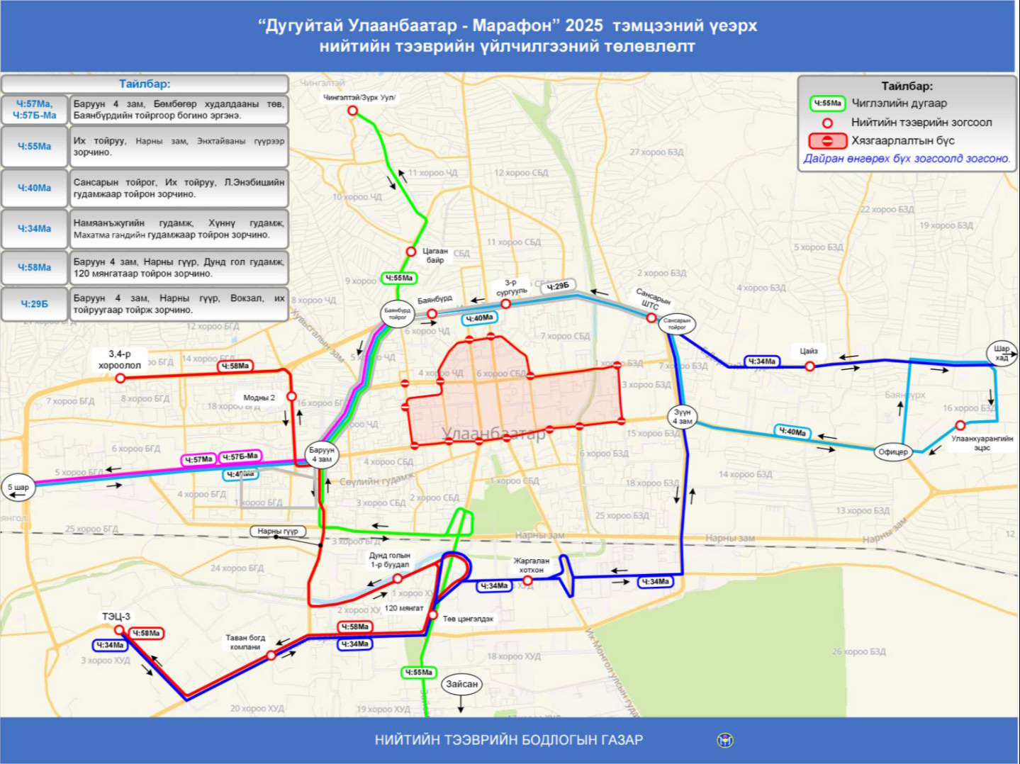 Түүнчлэн хотын төвийн буюу Их тойруу доторх гол гудамж, замууд хаагдах үед нийтийн тээврийн үйлчилгээний чиглэлүүд хойгуураа Их тойруугийн гудамж, урдуур Нарны зам, Намъяанжугийн гудамжаар явах бөгөөд хойноос урагш болон урдаас хойш явдаг босоо чиглэлүүд болох Баруун 4 зам, Нарны гүүр, Зүүн 4 замаар үйлчлэх ба орой 18:00 цагаас хойш үндсэн замналаар үйлчилгээ үргэлжилнэ.