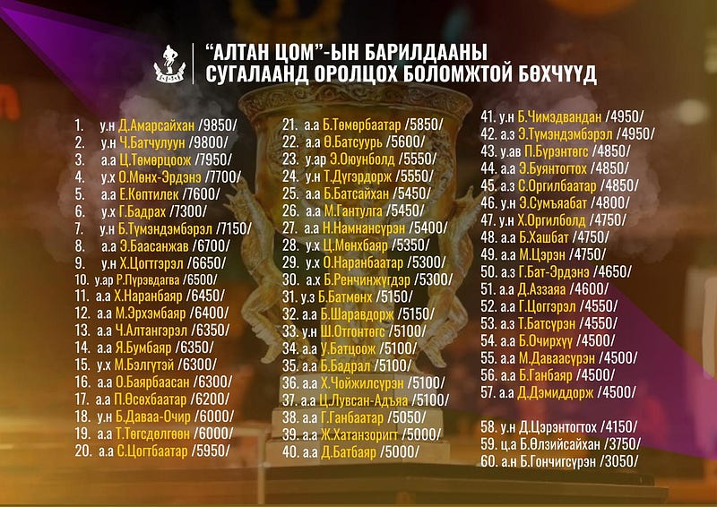 Монголын Үндэсний бөхийн холбооны “Алтан цом 2025” барилдаанд Үндэсний шилдэг 8 компанийн баг өрсөлдөнө. Баг тус бүр 8 гишүүнтэй байх бөгөөд 3 гишүүнийг сонгож, үлдсэн 5 бөхийг сугалаагаар тодруулах юм байна.